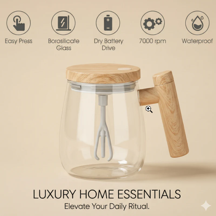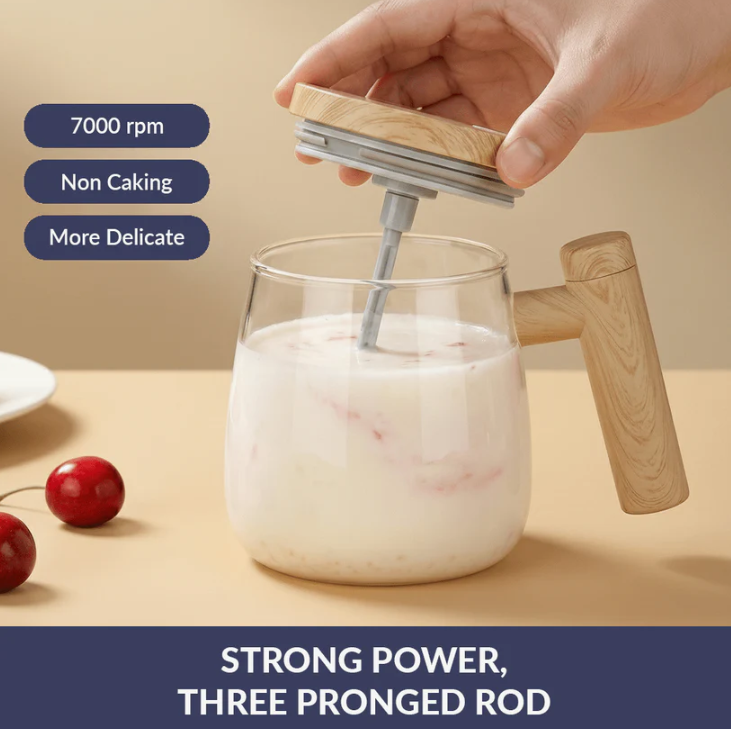 This clean, one-tap mug uses a fast, built-in whisk to blend coffee, tea, cocoa, protein shakes, and other powdered drinks right inside the cup – no spoon, no clumps, no mess. Made from heat-resistant borosilicate glass with a wood‑tone lid and handle for a simple, modern look that fits kitchens, offices, or gifting.